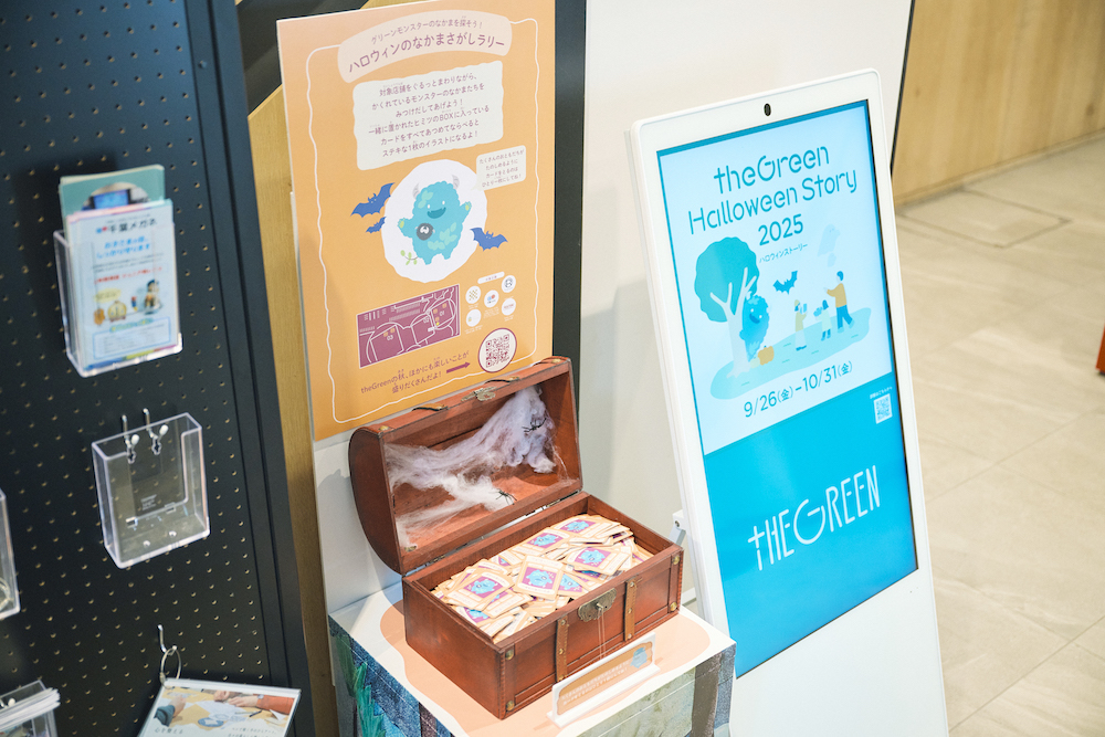 「theGreen Halloween Story」、今年は本格仕様のカードを集めて遊ぶ企画。見つけて・眺めて・集めて・並べてたのしい内容です。気になったら何はさておき01棟1階のエレベーター周辺、サイネージが設置されている場所まで。