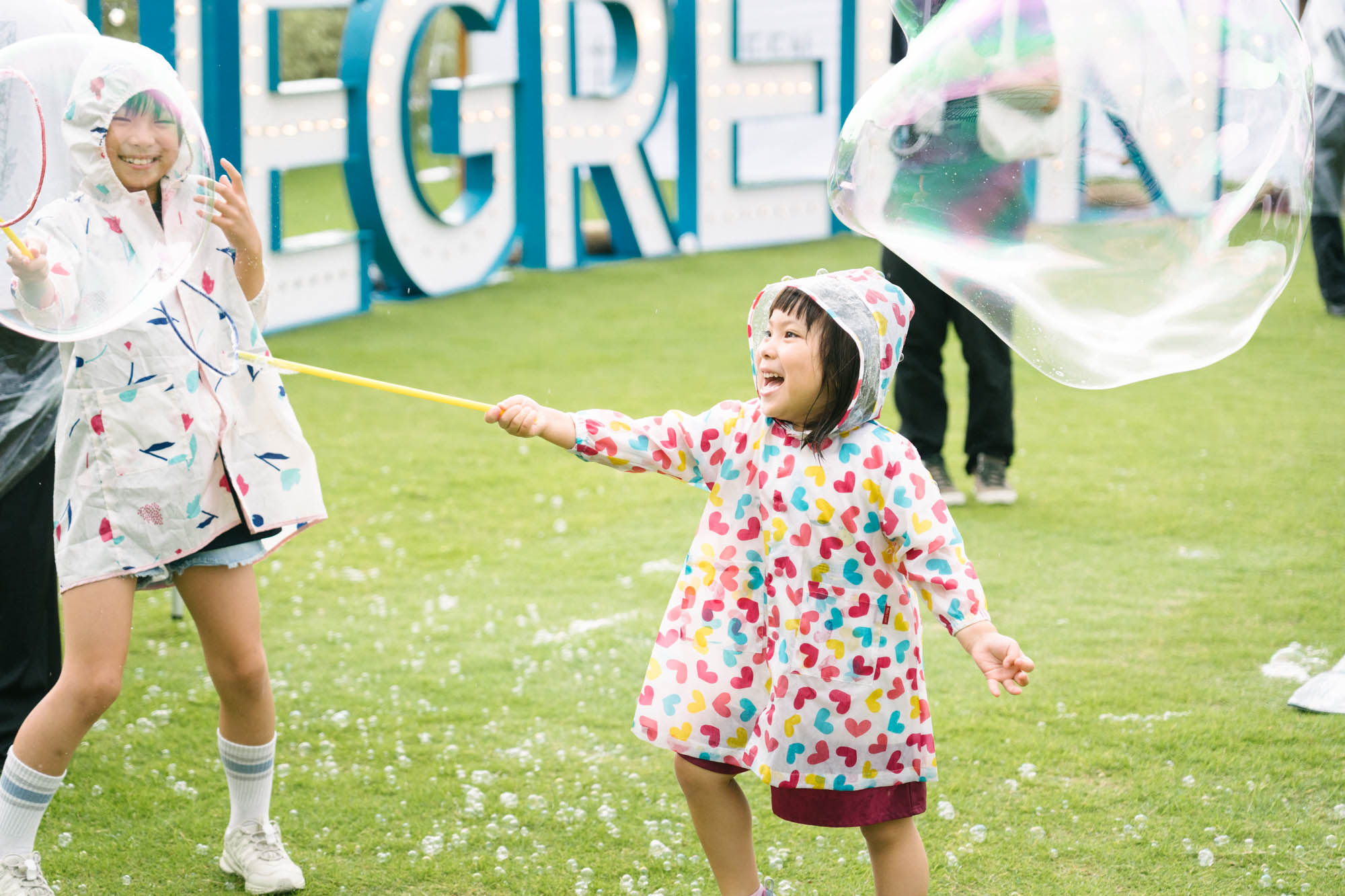 「(少々の)雨ニモマケズ」精神は、ところ変わってこちらでも。シャボン玉がわんさか浮遊してエキサイティング! 目を疑う眺めでした