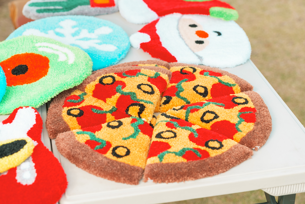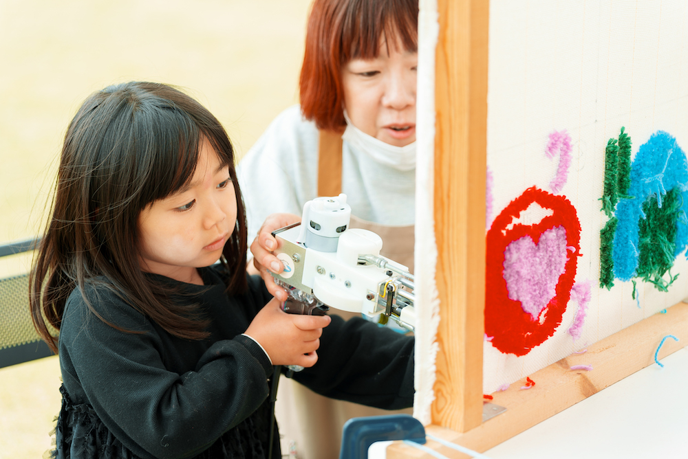 裏からドリルのような機械で打ち込む「タフティング」のワークショップではもこもことした質感の織物を自作。講師役のatelier todomeruによる作品群も並び、生地の風合とユーモア感が独特の魅力(↓)