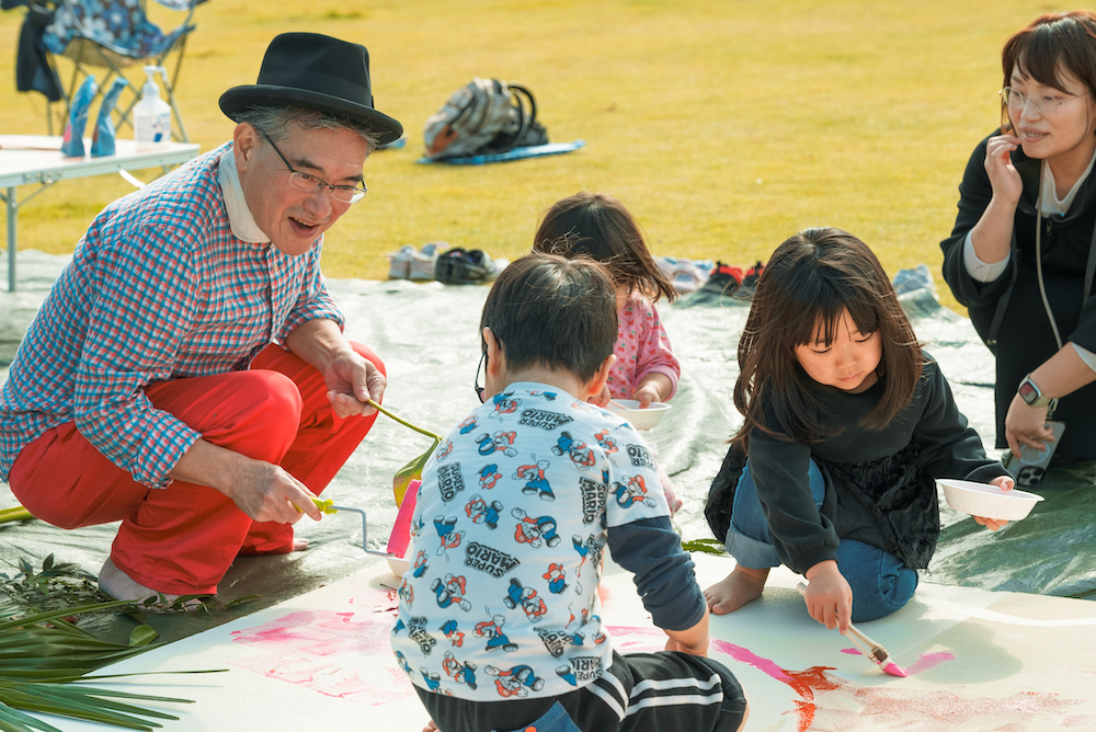対して“芸術の秋”。画家の出射(いでい)茂さん(左)と共に描く「インスピ★アート」では、誰ともなく手足を使い塗り始めました。全身絵画!