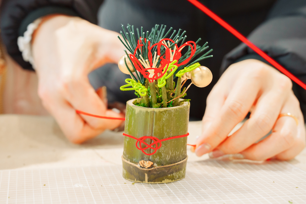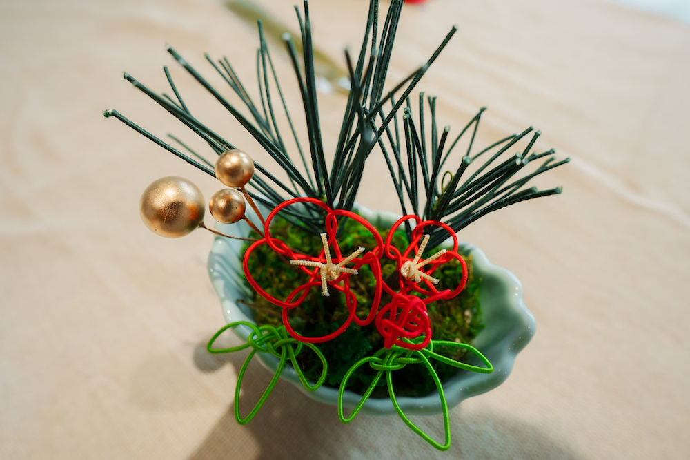 さて本番の門松制作。梅(赤)で練習の成果を存分発揮したら松(緑)と竹(黄緑)ともどもお好みの器へと盆栽感覚で配して。さまざまな材料と道具を駆使しての工作作業